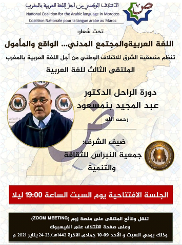 نظمت المنسقية الجهوية للائتلاف الوطني من أجل اللغة العربية بالشرق، يومي السبت والأحد 23-24 يناير2021، الملتقى الجهوي الثالث للغة العربية تحت شعار: اللغة العربية والمجتمع المدني.. الواقع والمأمول، دورة الراحل عبد المجيد بنمسعود.