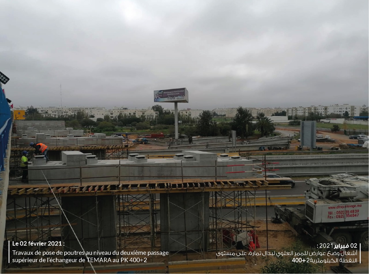 تنهي الشركة الوطنية للطرق السيارة بالمغرب إلى علم كافة زبناءها مستعملي الطريق السيار الرباط-الدار البيضاء بأنها ستقوم بأشغال وضع عوارض للممر العلوي لبدال تمارة، على مستوى النقطة الكيلومترية2+400 وذلك من يوم الأربعاء 03 فبراير 2021 على الساعة 00: 9 صباحًا وحتى 6:00 صباحًا من يوم الجمعة 05 فبراير2021.