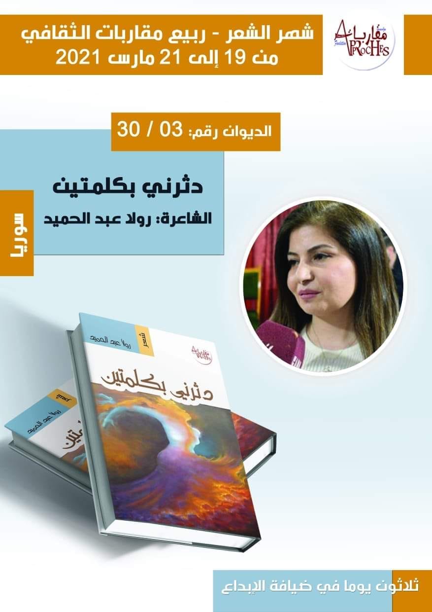 الديوان الثالث من دواوين شهر الشعر الثلاثين للشاعرة السورية رولا عبد الحميد بعنوان:” دثرني بكلمتين”