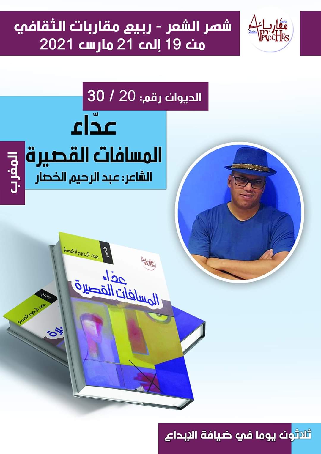 تنفيذا لمقترحها الإبداعي بنشر 30 ديوانا في شهر واحد من 19 فبراير الى 21 مارس 2021 تحت شعار : “لأن الشعر يستحق”، ضمن برنامج ربيع المؤسسة الثقافي 2021، أطلقت مؤسسة مقاربات العنوان الإبداعي العشرون للشاعر المغربي عبد الرحيم الخصار بعنوان:” عداء المسافات القصيرة “، ” لوحة الغلاف للفنان المبدع محمود الساجر.