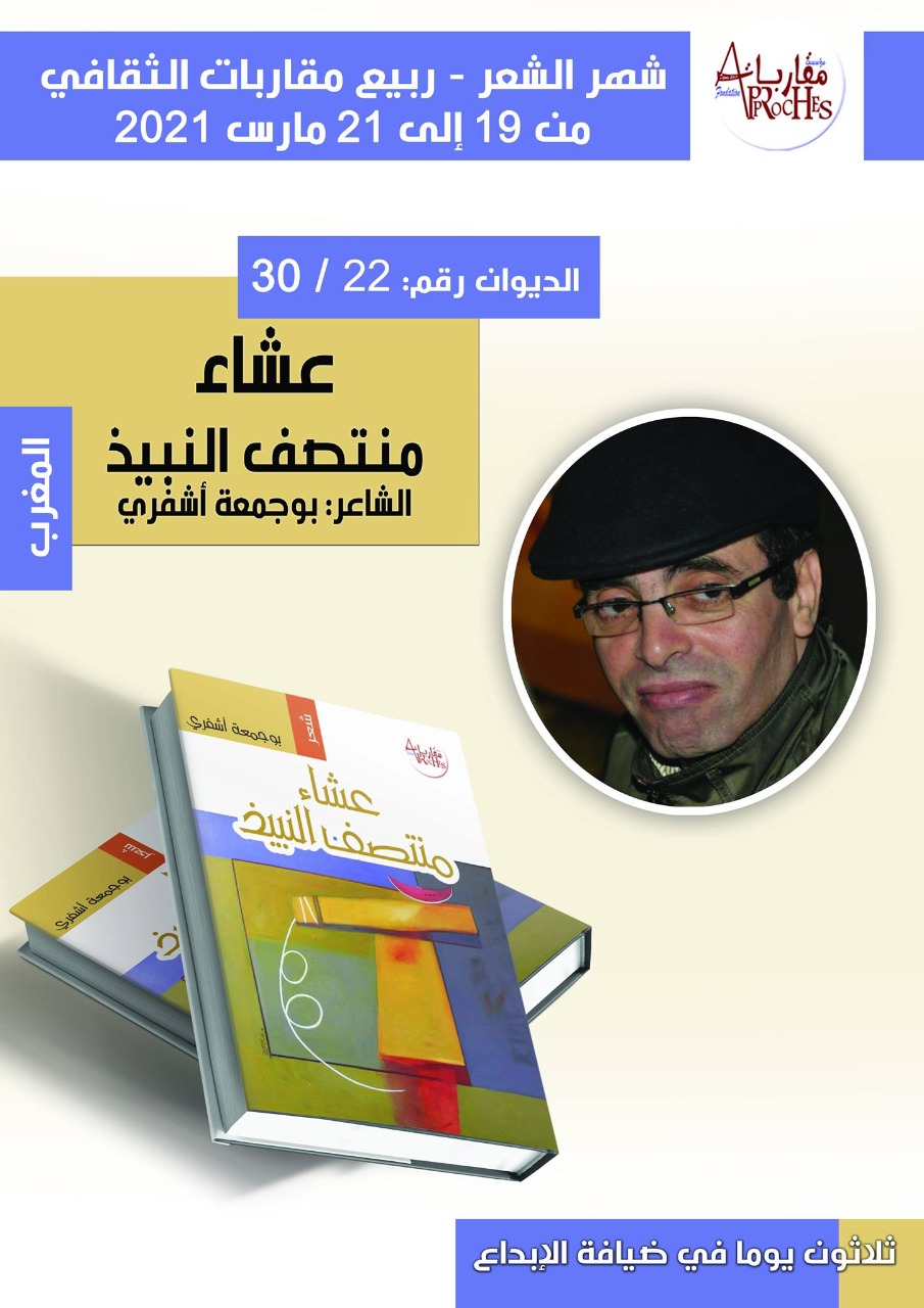 تنفيذا لمقترحها الإبداعي بنشر 30 ديوانا في شهر واحد من 19 فبراير الى 21 مارس 2021 تحت شعار : “لأن الشعر يستحق”، ضمن برنامج ربيع المؤسسة الثقافي 2021، أطلقت مؤسسة مقاربات العنوان الإبداعي الثاني للشاعر والناقد الفني المغربي بوجمعة أشفري بعنوان:” عشاء منتصف النبيذ” لوحة الغلاف للفنان المبدع محمود الساجر.