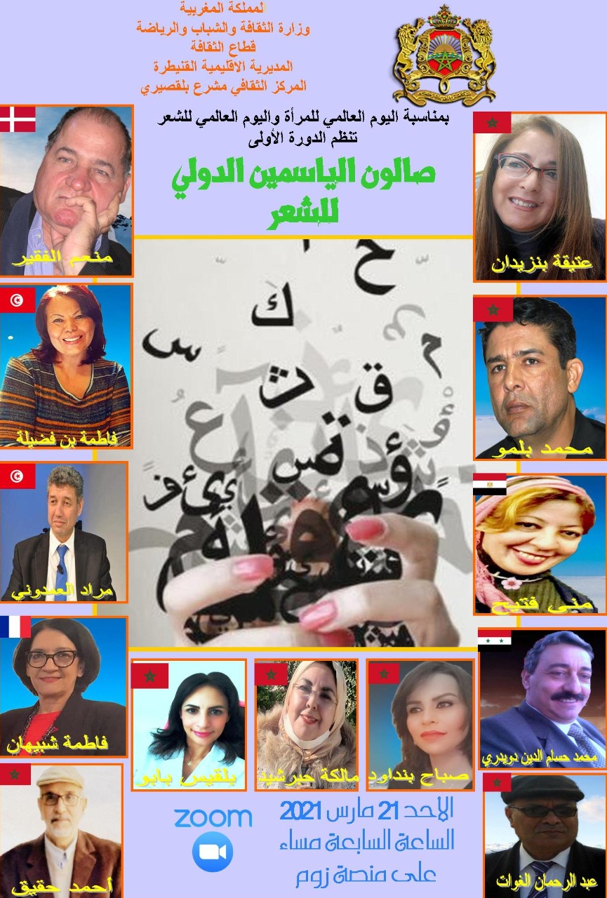 بمبادرة من الأديبة المغربية عتيقة بنزيدان وبمناسبة اليوم العالمي للمرأة الذي يصادف الثامن من مارس واليوم العالمي للشعر الذي يصادف الواحد والعشرون من مارس ينظم المركز الثقافي مشرع بلقصيري الدورة الأولى لصالون الياسمين الدولي للشعر.