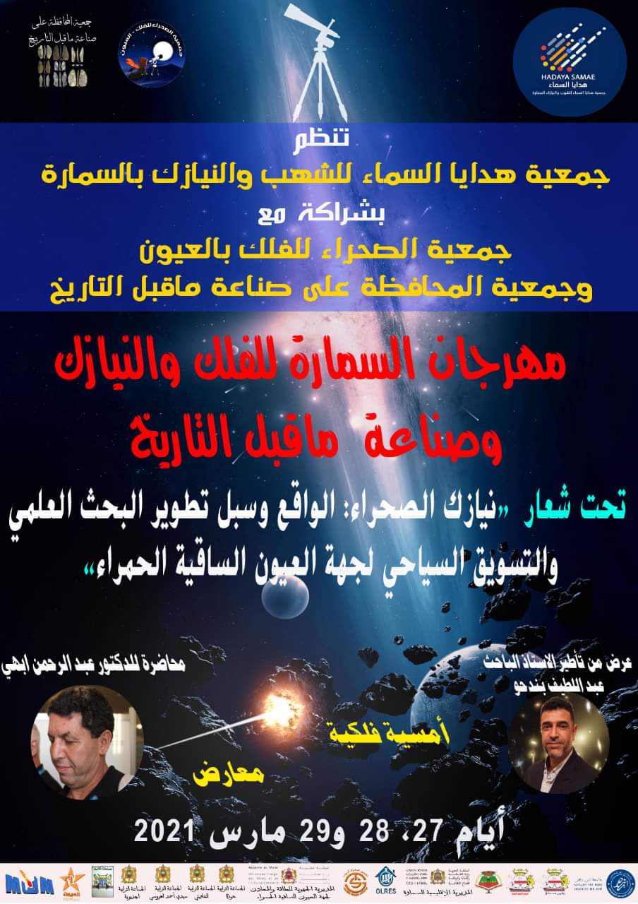 مدينة السمارة على موعد انطلاق أول دورة لمهرجان النيازك والفلك وصناعة ماقبل التاريخ أيام 27-28و29مارس 2021 الذي يحمل شعار : ” نيازك الصحراء الواقع وسبل تطوير البحث العلمي والتسويق السياحي لجهة العيون الساقية الحمراء ”.
