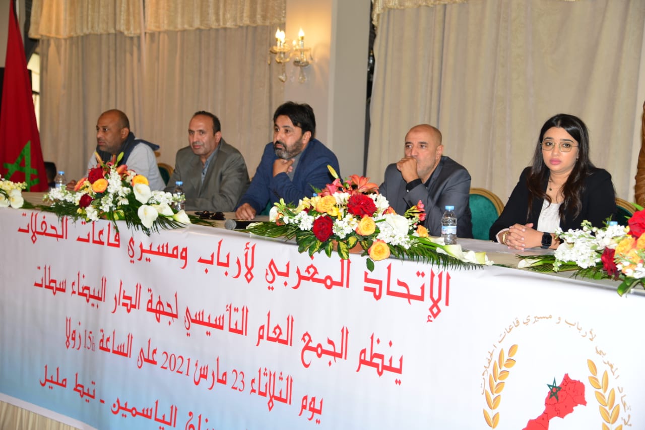 في إطار إتمام هياكل الإتحاد المغربي لأرباب و مسيري قاعات الحفلات، أشرف المكتب التنفيذي بحضور جمال ألحيان رئيس الإتحاد بمعية أعضاء المكتب والمدير الإداري، على اشغال الجمع العام التأسيسي للمكتب الجهوي لجهة الدار البيضاء سطات، يوم الثلاثاء 23 مارس 2021 , بقاعة جنان الياسمين تيط مليل.