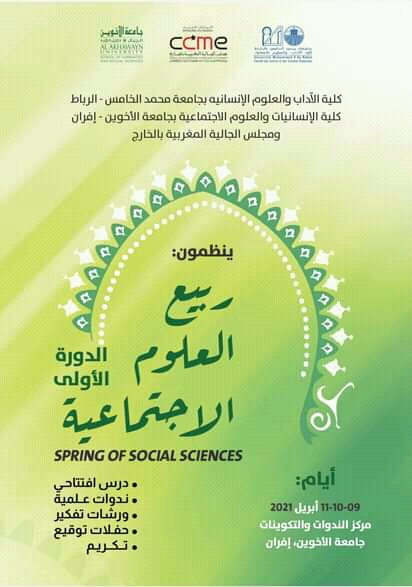 تنعقد بمدينة إفران، أيام 9-10-11 أبريل 2021، فعاليات الدورة الأولى لربيع العلوم الاجتماعية، والمنظم من طرف كلية الآداب والعلوم الإنسانية، جامعة محمد الخامس الرباط، وكلية الإنسانيات والعلوم الاجتماعية، جامعة الأخوين إفران، ومجلس الجالية المغربية بالخارج، وذلك بمركز الندوات والتكوينات التابع لجامعة الأخوين، بإفران.