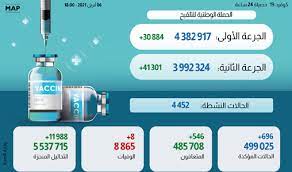 وبحسب النشرة، فقد أصبح مؤشر الإصابة التراكمي بالمغرب يبلغ 1372,3 إصابة لكل مائة ألف نسمة، بمؤشر إصابة يبلغ 1.9 لكل مائة ألف نسمة خلال الـ24 ساعة المنصرمة، فيما يصل مجموع الحالات النشطة التي تتلقى العلاج حاليا إلى 4452 حالات.