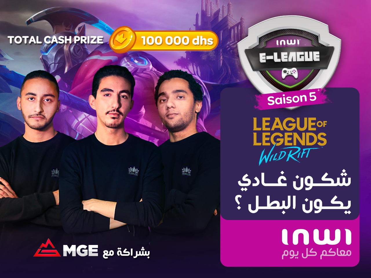 بعد نجاحها الكبير على مدى سنوات، تعود inwi e-league هذه السنة في موسم خامس استثنائي ابتداء من يوم الإثنين 03 مايو 2021 وسيشهد موسم inwi e-league الجديد، الذي ينظم بتعاون مع المغربية لتطوير الألعاب الإلكترونية (MGE)، تنافس أفضل ممارسي ألعاب الفيديو بالمغرب، وذلك في اللعبتين الرئيسيتين للناشر RIOT، وهما لعبة League of Legends – Wild Rift على أجهزة الهاتف النقال، وValorant على أجهزة الكومبيوتر. وسيتنافس اللاعبون المغاربة خلال هذه الدورة للفوز بجوائز مالية إجمالية تبلغ 100 ألف درهم.