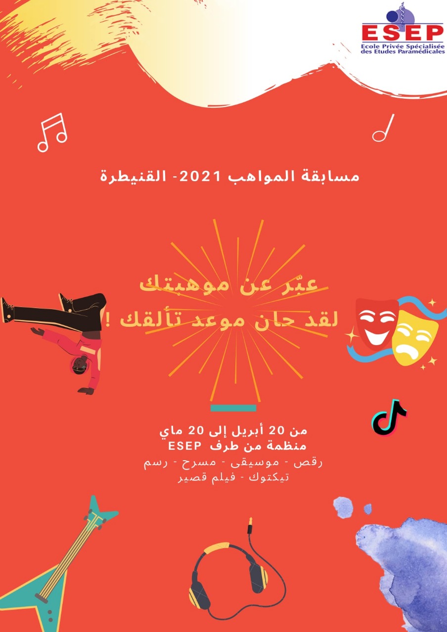 بمبادرة من الفاعل الثقافي الفنان محمد البدري والطبيبة الدكتورة مريم الكتاني وفي أول مبادرة تجمع بين قطاعي الثقافة والصحة تنظم المدرسة المختصة في القطاعات الشبه الطبية بمدينة القنيطرة في اطار الاحترازات الصحية التي فرضتها جائحة كورونا ، مسابقة كبرى عن بعد لإبداعات الشباب في عدة مجالات فنية في الفترة ما بين 20 أبريل و 20 ماي 2021 تحت شعار ” ابداعات شبابية لمغرب ما بعد جائحة كورونا “.