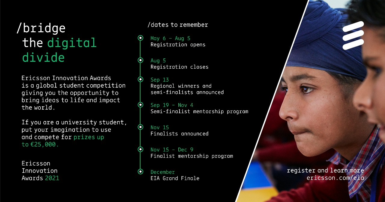 أطلقت إريكسون رسميًا المسابقة السنوية لجوائز إريكسون للابتكار (EIA) 2021، وهي مسابقة عالمية تقدم لطلاب الجامعات في جميع أنحاء العالم الفرصة لتطوير أفكار جديدة ومبتكرة بدعم من خبراء إريكسون.