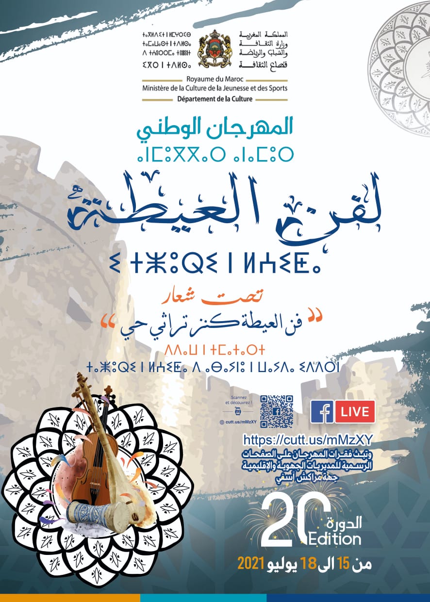 في إطار الحفاظ على التراث الغنائي الشعبي وخصوصا فن العيطة تنظم وزارة الثقافة والشباب و الرياضة – قطاع الثقافة – بمدينة آسفي أيام 15- 16- 1718- يوليوز 2021، الدورة العشرين للمهرجان الوطني لفن العيطة تحت شعار ” العيطة ، كنز تراثي حي “.