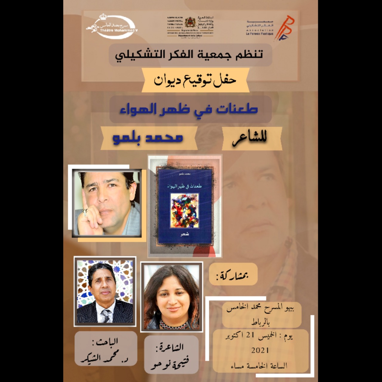 تنظم جمعية الفكر التشكيلي يوم الخميس 21 أكتوبر 2021 حفل توقيع ديوان “طعنات في ظهر الهواء” للشاعر محمد بلمو الذي أصدرته ضمن منشوراتها في دجنبر 2019 وتعذر إقامة حفلات لتوقيعه بسبب وباء كورونا.