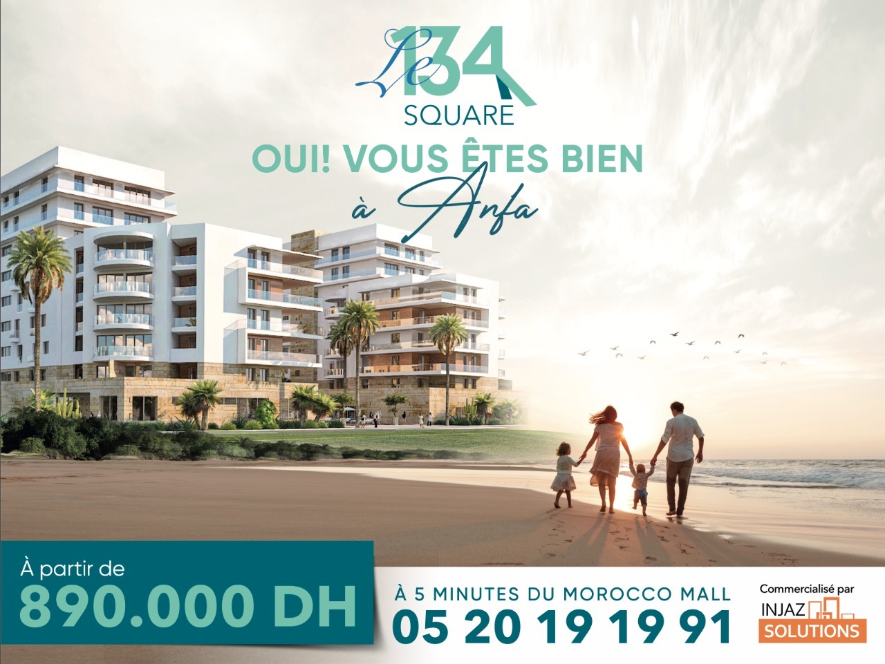 يمكن الوصول إليه مباشرة عبر الطريق المؤدية لدار بوعزة , يطل ” 134 SQUARE” على البحر ويتمتع بموقع استراتيجي جنوب بلدية أنفا. إنه مشروع عالي المستوى وآمن يتيح الوصول إلى الشاطئ كما أن له واجهات رائعة تعكس مناظر خلابة تطل على البحر. بالإضافة إلى ذلك، يوفر المشروع جميع وسائل الراحة الممتازة للسكان حتى تتحسن حياتهم اليومية.