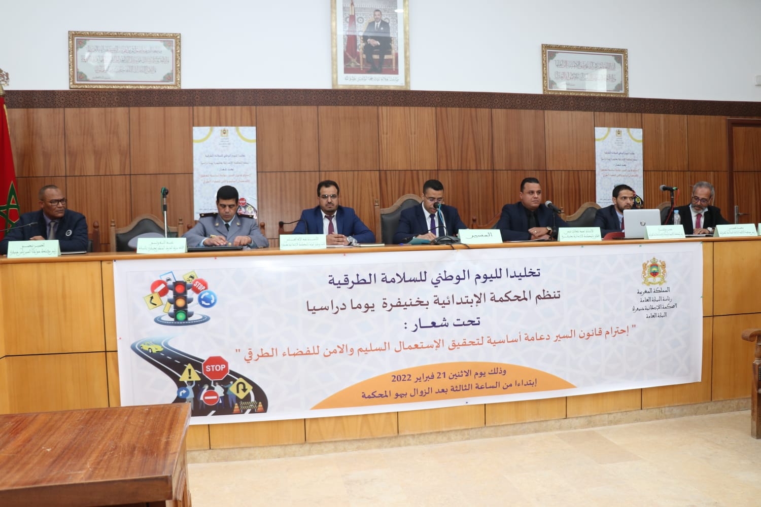 نظمت النيابة العامة بالمحكمة الابتدائية بخنيفرة، اليوم الاثنين، يوما دراسيا بالتزامن مع تخليد اليوم الوطني للسلامة الطرقية، تحت شعار ” احترام قانون السير دعامة أساسية لتحقيق الاستعمال السليم والآمن للفضاء الطرقي ”