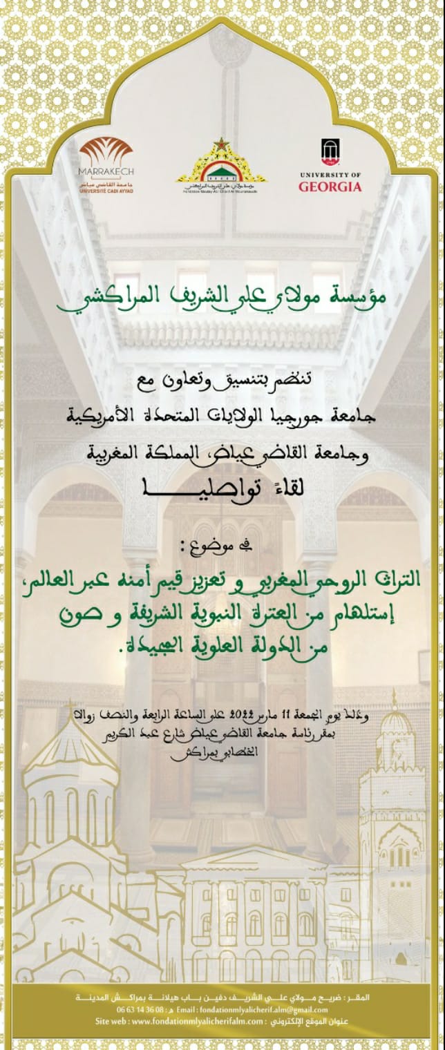 تنظم مؤسسة مولاي علي الشريف دفين مراكش بتنسيق وتعاون مع جامعة جورجيا بالولايات المتحدة الأمريكية وجامعة القاضي عياض لقاء تواصليا حول موضوع: “التراث الروحي المغربي وتعزيز قيم آمنة عبر العالم – استلهام من العترة النبوية الشريفة وصون من الدولة العلوية المجيدة- “وذلك يوم الجمعة 11 مارس 2022 على الساعة الرابعة والنصف بعد الزوال بمقر رئاسة جامعة القاضي عياض بمراكش.
