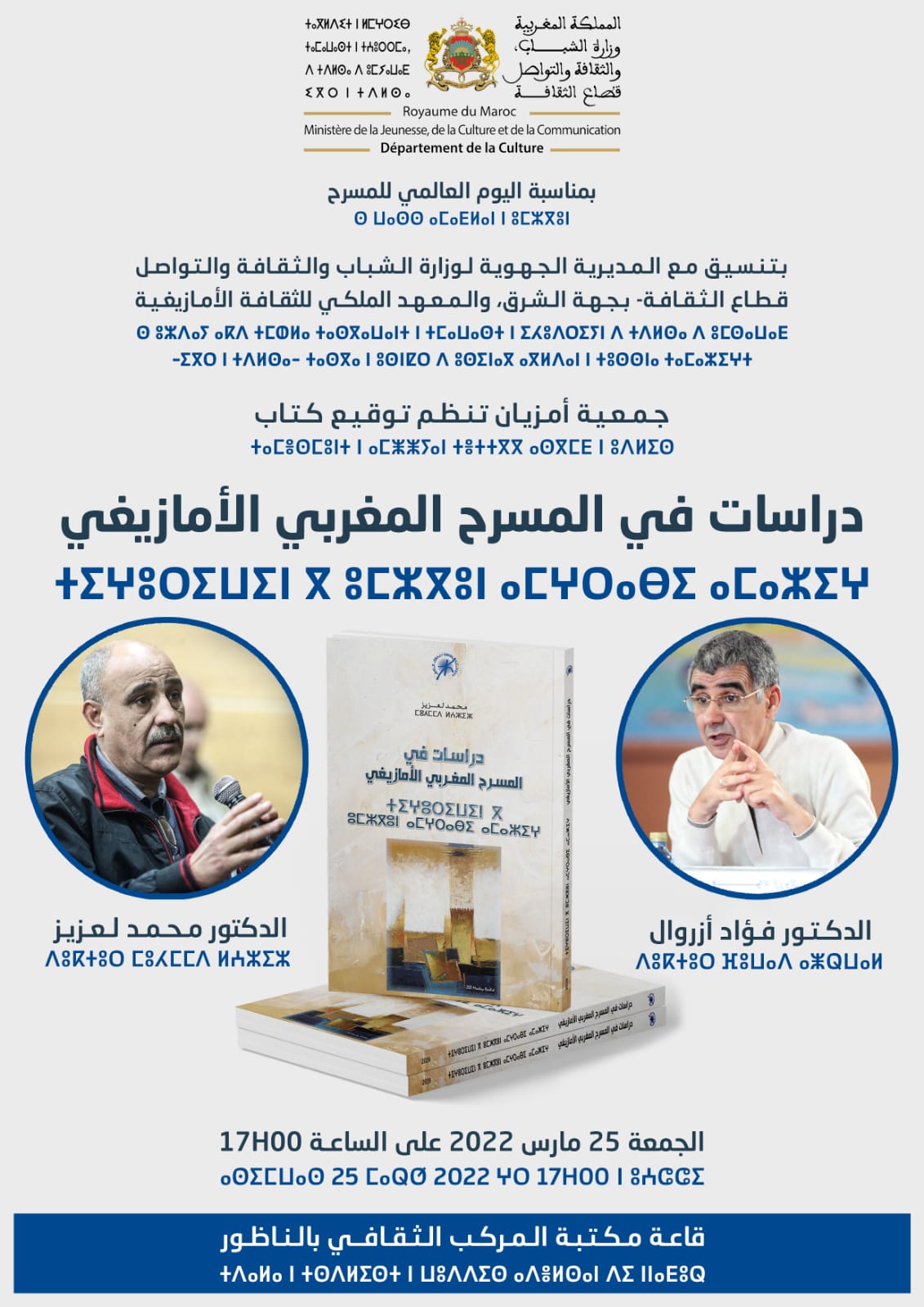 بمناسبة اليوم العالمي للمسرح وبتنسيق مع المديرية الجهوية لوزارة الشباب والثقافة والتواصل -قطاع الثقافة- بجهة الشرق، والمعهد الملكي للثقافة الأمازيغية، تنظم جمعية أمزيان حفل تقديم وتوقيع كتاب “دراسات في المسرح المغربي الأمازيغي”، وسيشارك في حفل التوقيع كل من الدكتور محمد لعزيز: أستاذ باحث وناقد مسرحي، والدكتور فؤاد أزروال: أستاذ باحث بالمعهد الملكي للثقافة الأمازيغية، وذلك يـوم الجمعة 25 مارس 2022، بقاعة مكتبة المركب الثقافي بالناظور، ابتداء من الساعة الخامسة مساء.