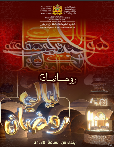 انسجاما مع الأجواء الروحانية لشهر رمضان المبارك، تنظم المديرية الجهوية للثقافة مراكش أسفي فعاليات ” روحانيات ليالي رمضان” من خلال مجموعة من الحفلات الفنية ذات طابع روحاني في الفترة الممتدة ما بين 12 و25 أبريل 2022 م الموافق من 10 و23 رمضان 1443ه.