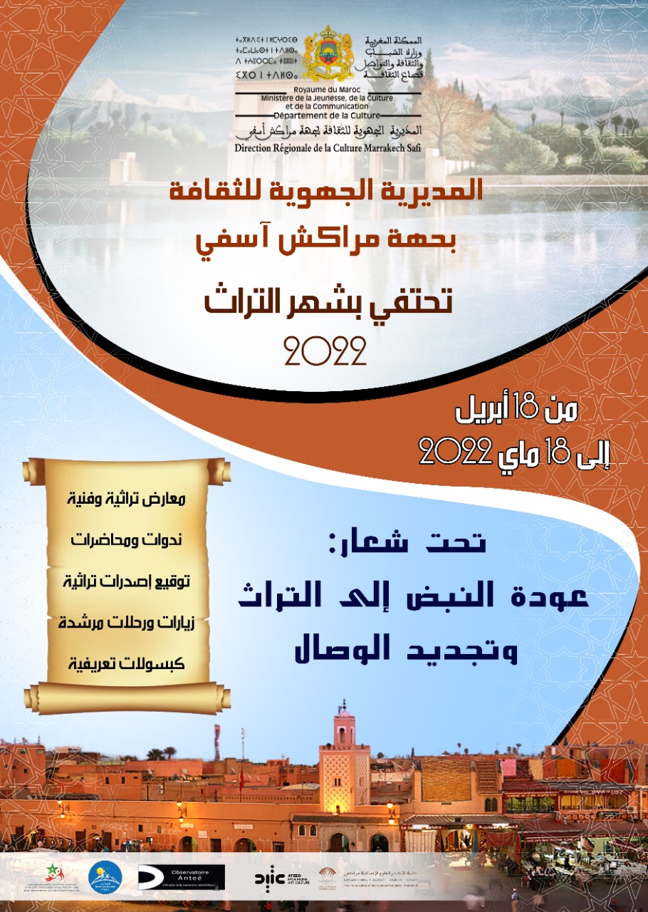 احتفاء بشهر التراث تنظم المديرية الجهوية للثقافة مراكش- أسفي في الفترة الممتدة ما بين 18 أبريل و18 ماي 2022 برنامجا ثقافيا متنوعا تحت شعار “عودة النبض إلى التراث وتجديد الوصال”، وتسعى المديرية الجهوية للثقافة بمراكش من خلال هذا الموعد الثقافي المتجدد إلى تثمين الموروث الثقافي المغربي والتعريف بغنى وتنوع التراث بالجهة بشقيه المادي واللامادي وامتداداته الحضارية.