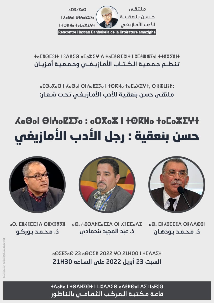 تنظم جمعية الكتاب الأمازيغي وجمعية أمزيان بالناظور الدورة الأولى لـ “ملتقى حسن بنعقية للأدب الأمازيغي”، تحت شعار: “حسن بنعقية: رجل الأدب الأمازيغي”، وذلك يوم السبت 23 أبريل 2022، بقاعة مكتبة المركب الثقافي بالناظور، على الساعة التاسعة والنصف ليلا.