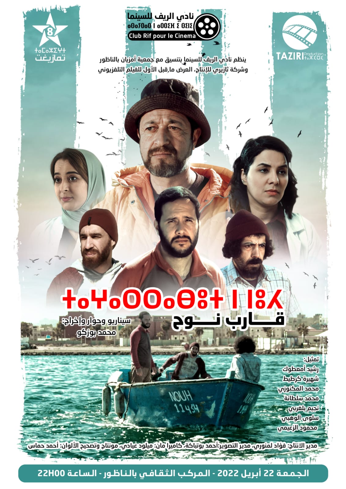 الفيلم التلفزيوني “ثغارابوط ن نوح” (قارب نوح)، سيناريو وحوار وإخراج:محمد بوزكو، تمثيل: رشيد أمعطوك، شهيرة كرطيط، محمد المكنوزي، محمد سلطانة، نجيم بلغربي، سلوى الوهبي، محمود الزعيمي، بنعيسى المستري، علي كوراجي، سميرة المصلوحي، رحال دريوش، أيمن ديبة، مدير الانتاج: فؤاد لمنوري، مدير التصوير: أحمد بوتباكة، كاميرا مان: ميلود عيادي، مونتاج وتصحيح الألوان: أحمد حماس.
