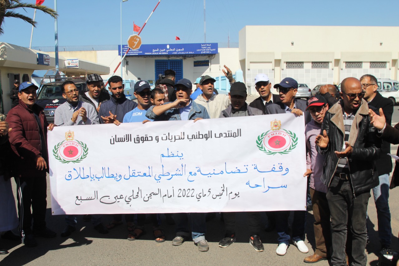 نظم مجموعة من النشطاء والفعاليات المدنية زوال يوم أمس الخميس 5 ماي الحالي، أمام السجن المحلي “عكاشة” بعين السبع، وقفة تضامنية مع الشرطي المعتقل على خلفية وفاة شاب كان على متن دراجة نارية.