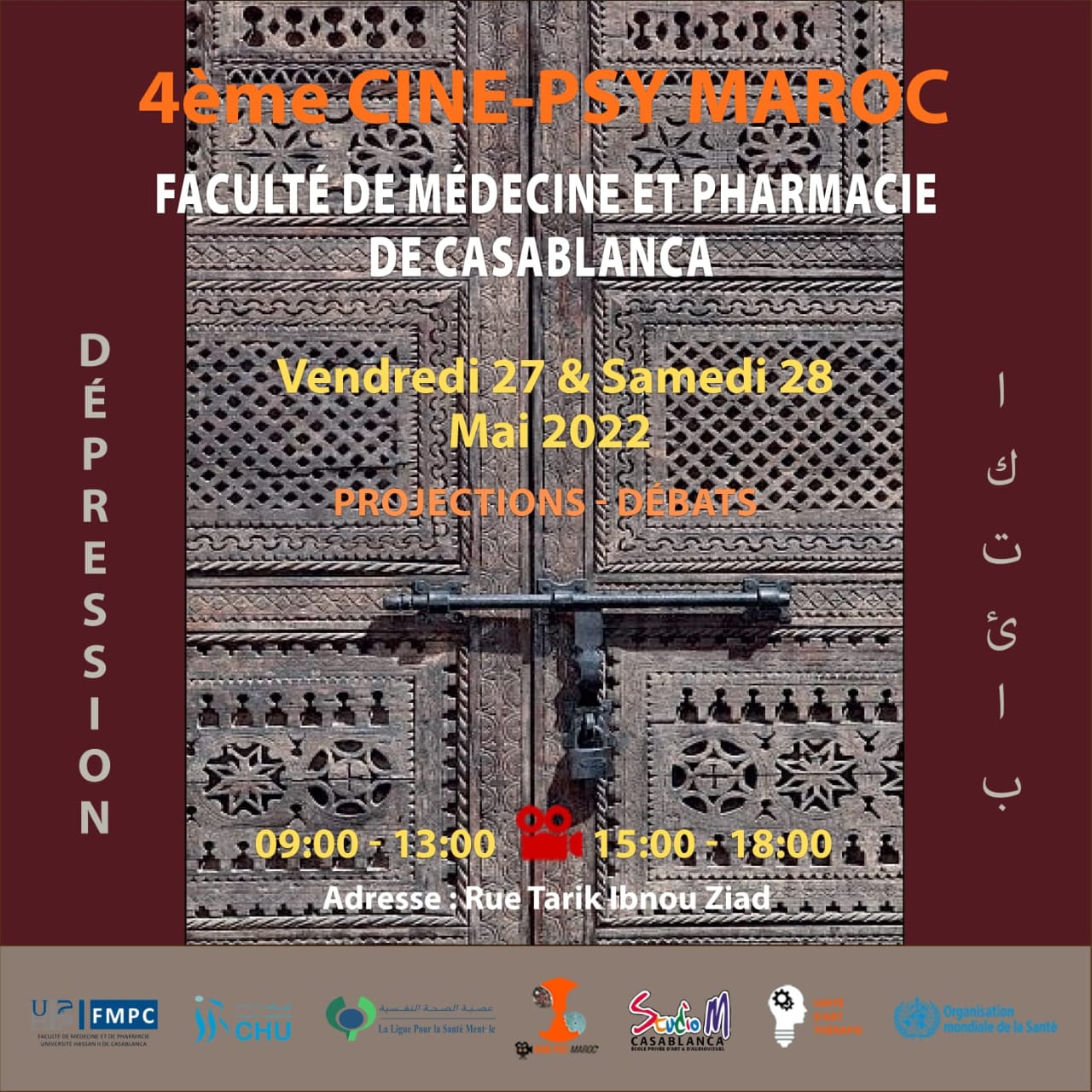 تنعقد الدورة الرابعة لمؤتمر CinépsyMaroc يومي 27 و 28 مايو 2022 بكلية الطب والصيدلة بالدار البيضاء (شارع طارق بن زياد).