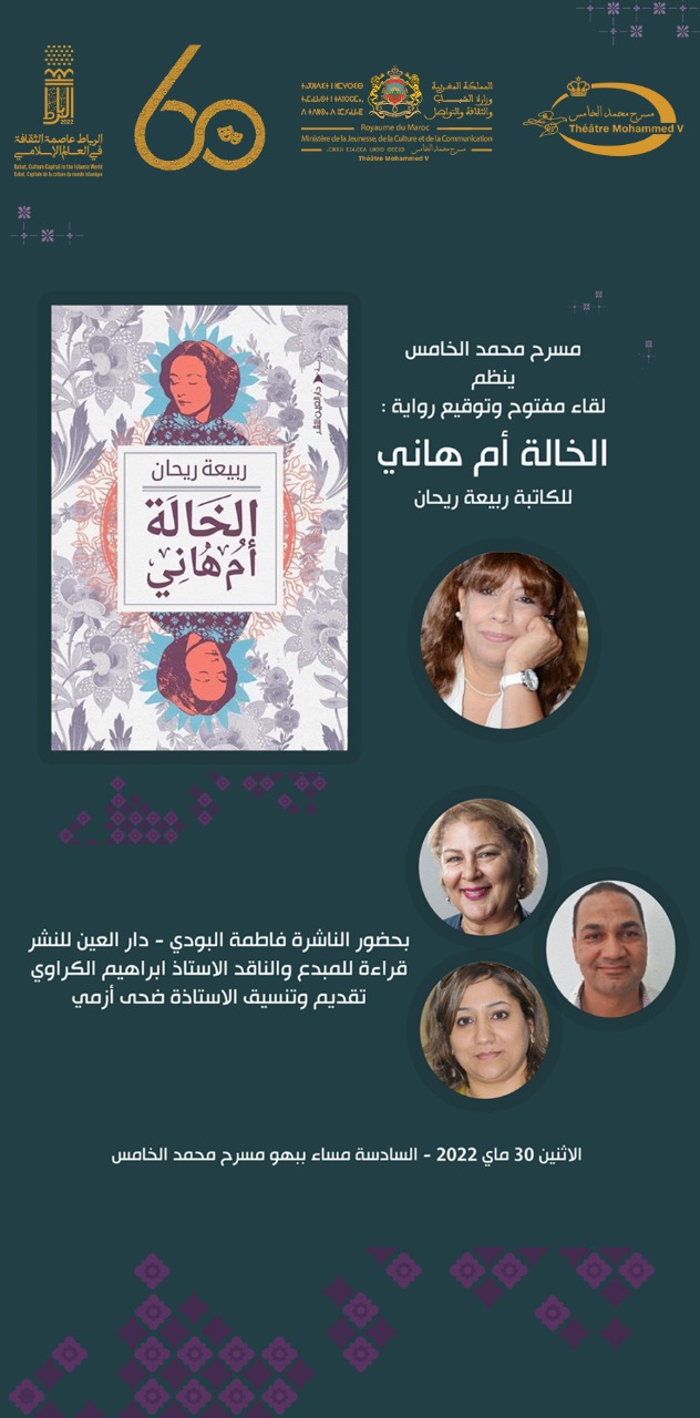 يستعد مسرح محمد الخامس بمدينة الرباط يوم السبت 30 ماي 2022، لتنظيم لقاء مفتوح وتوقيع رواية “الخالة أم هاني” للكاتبة المغربية ربيعة ريحان.