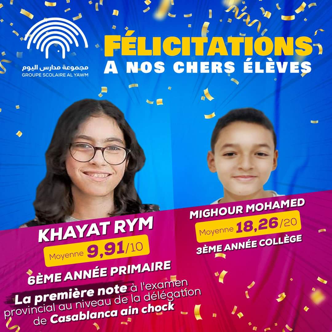 تصدّرت تلميذة بمجموعة مدارس اليوم الخاصة قائمة المتفوقين والمتفوقات على مستوى الامتحانات الإشهادية لمستوى السادس ابتدائي بتراب المديرية الإقليمية لوزارة التربية الوطنية والتعليم الأولي والرياضة بعين الشق بالدارالبيضاء بحصولها على معدل 9.91 على 10، لتؤكد بذلك على المسار التصاعدي تربويا وبيداغوجيا الدي توقّع عليه المؤسسة وتلامذتها على حد سواء، منذ أن فتحت أبوابها في فاتح شتنبر 2014.