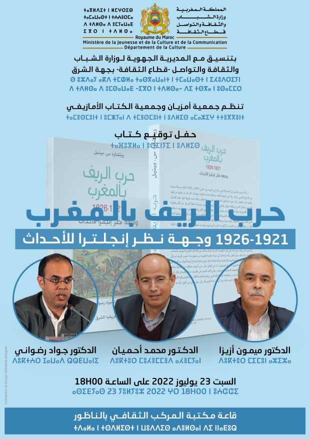 بتنسيق مع المديرية الجهوية لوزارة الشباب والثقافة والتواصل -قطاع الثقافة- بجهة الشرق، تنظم جمعية أمزيان بالناظور وجمعية الكتاب الأمازيغي، حفل توقيع كتاب “حرب الريف بالمغرب 1921-1926، وجهة نظر إنجلترا للأحداث”، وذلك بمناسبة الذكرى المائة وواحد لمعركة أنوال المجيدة، التي حقق فيها المقاومون والمجاهدون المغاربة الأفذاذ بقيادة البطل محمد بن عبد الكريم الخطابي، انتصارا كبيرا على قوات الاحتلال الاسباني.