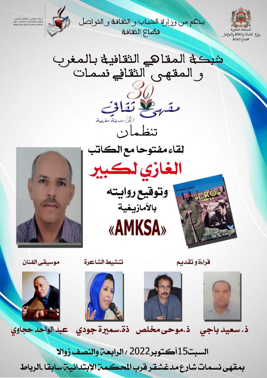 تنظم شبكة المقاهي الثقافية بالمغرب في إطار مشروعها الثقافي ” 30مقهى ثقافي 30مدينة مغربية ” لقاء مفتوحا مع الكاتب الغازي لكبير ، وتوقيع روايته بالأمازيغية ” أمكسا ” ، وذلك يوم السبت 15 أكتوبر 2022 بمقهى نسمات الكائنة بشارع مدغشقر قرب المحكمة الإبتدائية سابقا بالرباط .