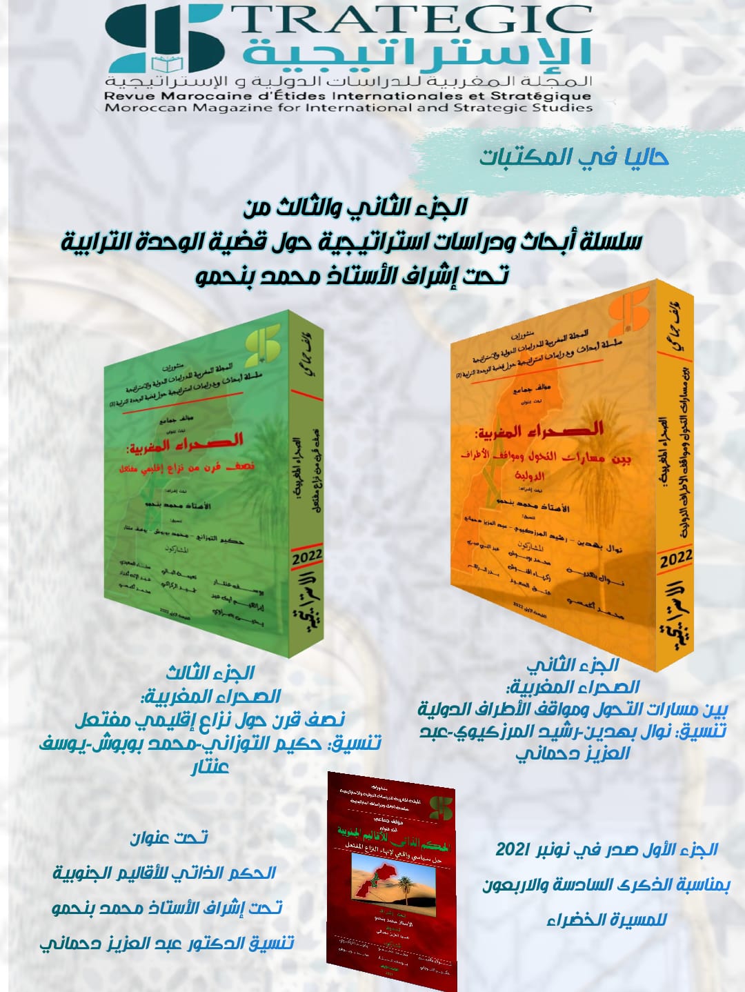 في هذا السياق، ومن أجل التفاعل مع هذه الحقائق والمستجدات، ووضعها في سياقها الدولي الذي يعرف الكثير من المتغيرات، بما تحمله من تأثير على مختلف المستويات، ومحاولة لتوفير مرجع شامل فيما يتعلق بقضية وحدتنا الترابية والالمام بمختلف العناصر المتداخلة فيها، أصدرت المجلة المغربية للدراسات الدولية والاستراتجية الجزئين الثاني والثالث من سلسلة الدراسات والأبحاث الاستراتيجية حول قضية الوحدة الترابية تحت إشراف الخبير والمتخصص في القانون الدولي الدكتور محمد بنحمو، الأول تحت عنوان “الصحراء المغربية: بني مسارات التحول ومواقف الأطراف الدولية”، والثاني تحت عنوان “الصحراء المغربية: نصف قرن على نزاع إقلي يم مفتعل”، وذلك بتنسيق ثلة من الأساتذة والباحثين “الدكتورة نوال بهدين، الدكتور رشيد المرزكيوي، الدكتور عبد العزيز دحماني، الدكتور حكيم التوزاني، الدكتور محمد بوبوش، الدكتور يوسف عنتار”، وتضمن مساهمات متميزة لخبراء ومتخصصين في الدراسات القانونية والتاريخية، وبشكل خاص في قضية وحدتنا الترابية، حاولوا من خلالها الوقوف على مختلف العناصر المؤطرة لهذا النزاع المفتعل، والأطراف الحقيقية التي تتحمل مسؤولية إطالته.