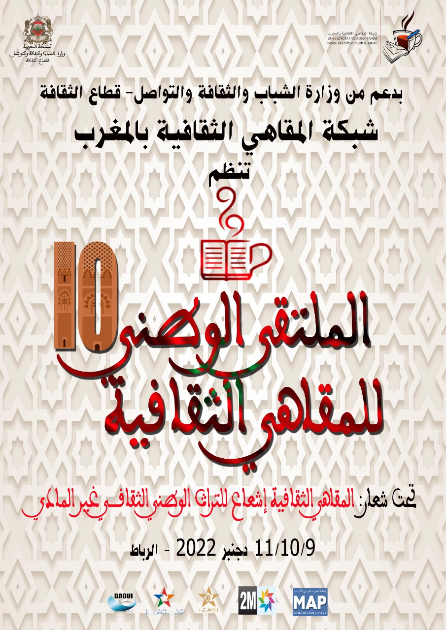 تستعد شبكة المقاهي الثقافية بالمغرب بدعم من وزارة الشباب والثقافة والتواصل قطاع الثقافة، لتنظيم الملتقى الوطني العاشر للمقاهي الثقافية تحت شعار “المقاهي الثقافية إشعاع للتراث الوطني الثقافي غير المادي “، وذلك أيام 9، 10و11 دجنبر 2022 حسب البرنامج التالي :