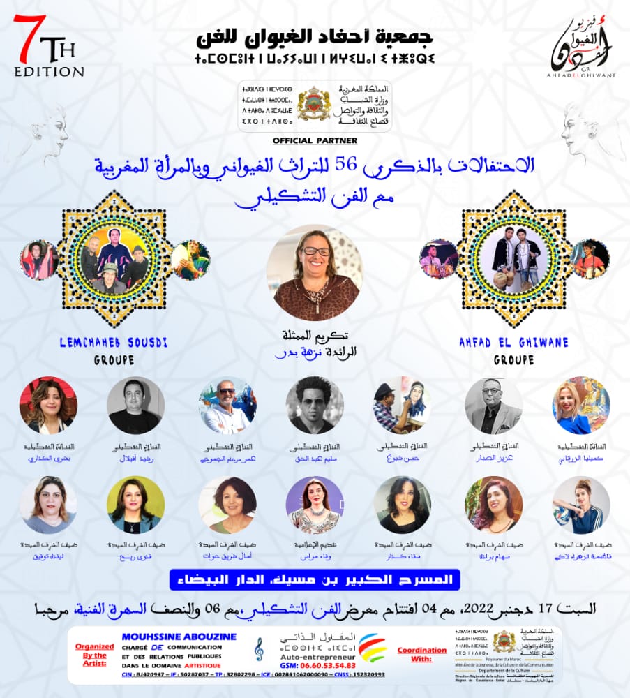 في إطار الإحتفالات بالذكرى 56 للتراث الغيواني وبالمرأة المغربية مع معرض الفن التشكيلي، تزامنا مع تأهل المنتخب الوطنـي إلى ربع النهائي لكأس العالم قطر 2022 ينظـم: المقاول الفنـي محسن أبوزين ” تظاهرة فنية و ثقافية ” تحت شعار ” المرأة المغربية والفنون التراثية ودورهما الفعال في التربية على المواطنة ”