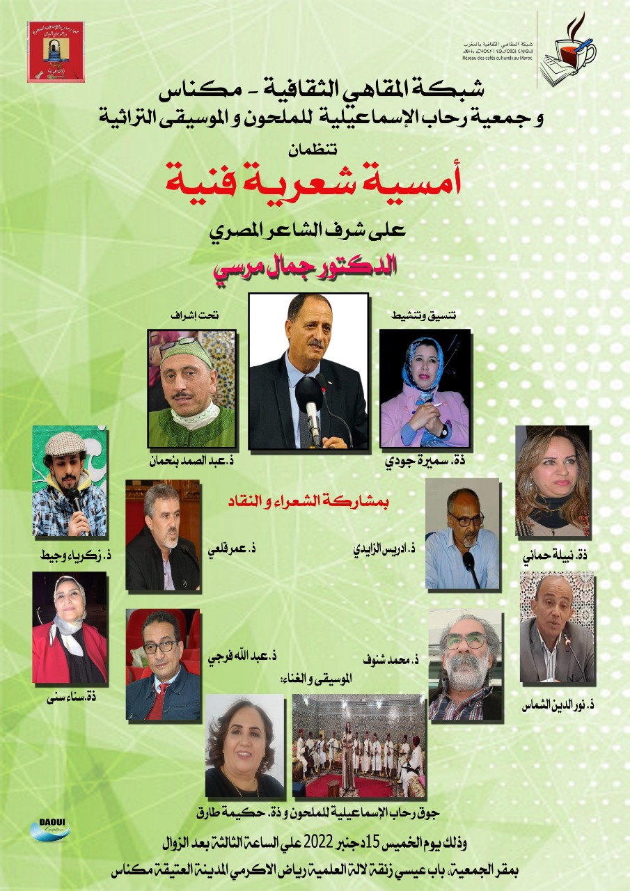 تنظم شبكة المقاهي الثقافية بالمغرب وجمعية رحاب الإسماعيلية للملحون والموسيقى التراثية بمكناس، أمسية شعرية فنية على شرف الشاعر المصري الدكتور جمال مرسي، بمشاركة الشعراء والنقاد وهم: نبيلة حماني ونورالدين الشماس وعبدالصمد بنحمان وزكرياء وجيط ومحمد شنوف وعبدالله فرجي وادريس زايدي وعمر قلعي وسناء سنى .