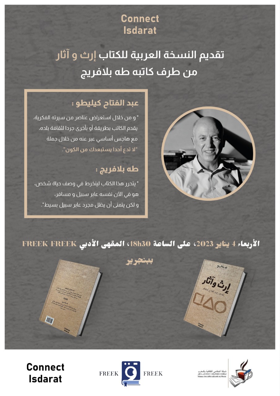 في إطار أنشطته الثقافية، ينظم المقهى الأدبي freek freek لقاء مع الكاتب طه بلافريج لتقديم النسخة العربية لكتاب “إرث وآثار ” .