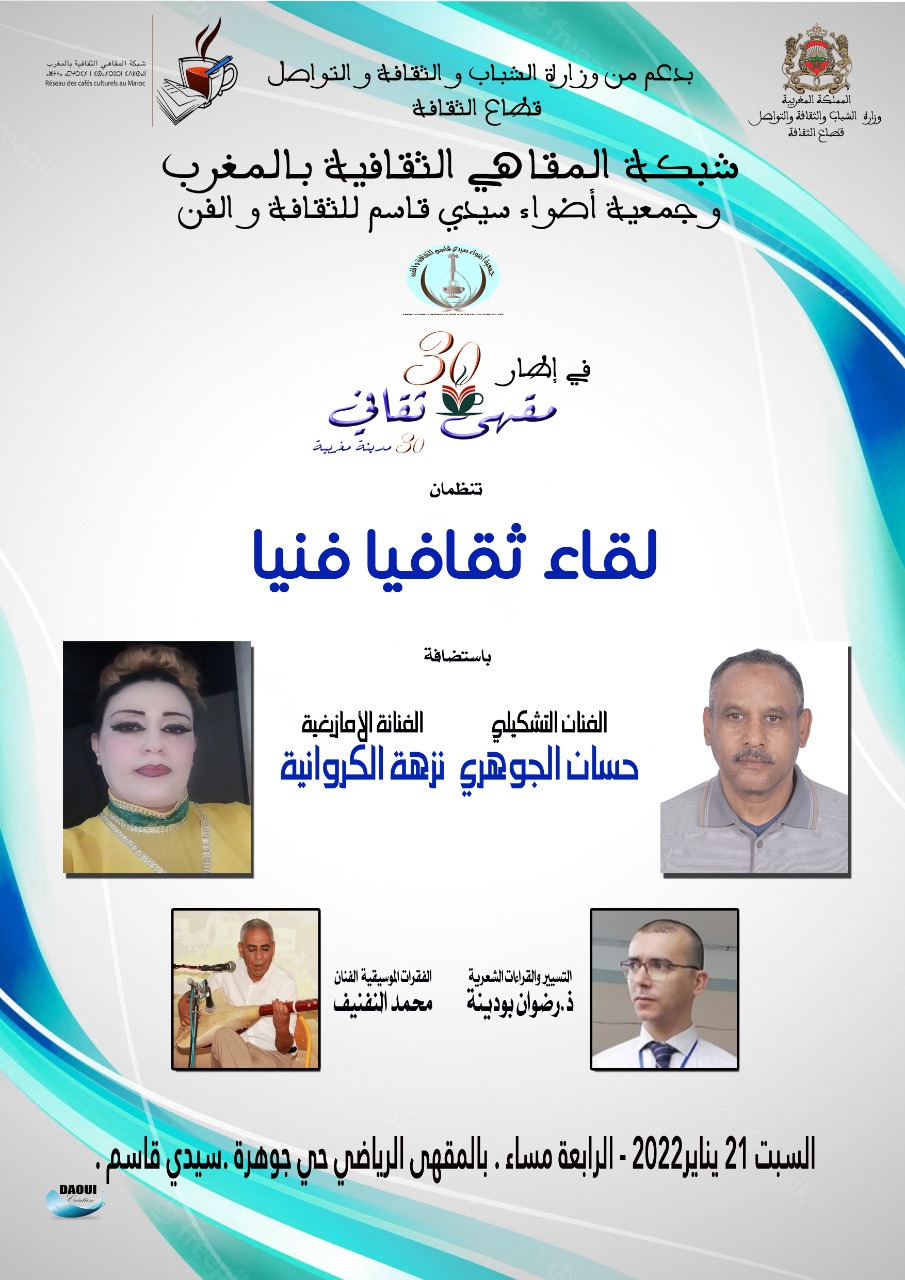 في إطار مشروع ” 30 مقهى ثقافي 30 مدينة مغربية ” ، تنظم شبكة المقاهي الثقافية بالمغرب وجمعية أضواء سيدي قاسم للثقافة والفن لقاء ثقافيا فنيا مع الفنان التشكيلي حسان الجوهري والفنانة الأمازيغية نزهة الكروانية يوم السبت21 يناير 2022 على الساعة الرابعة مساء بالمقهى الرياضي حي جوهرة بسيدي قاسم .