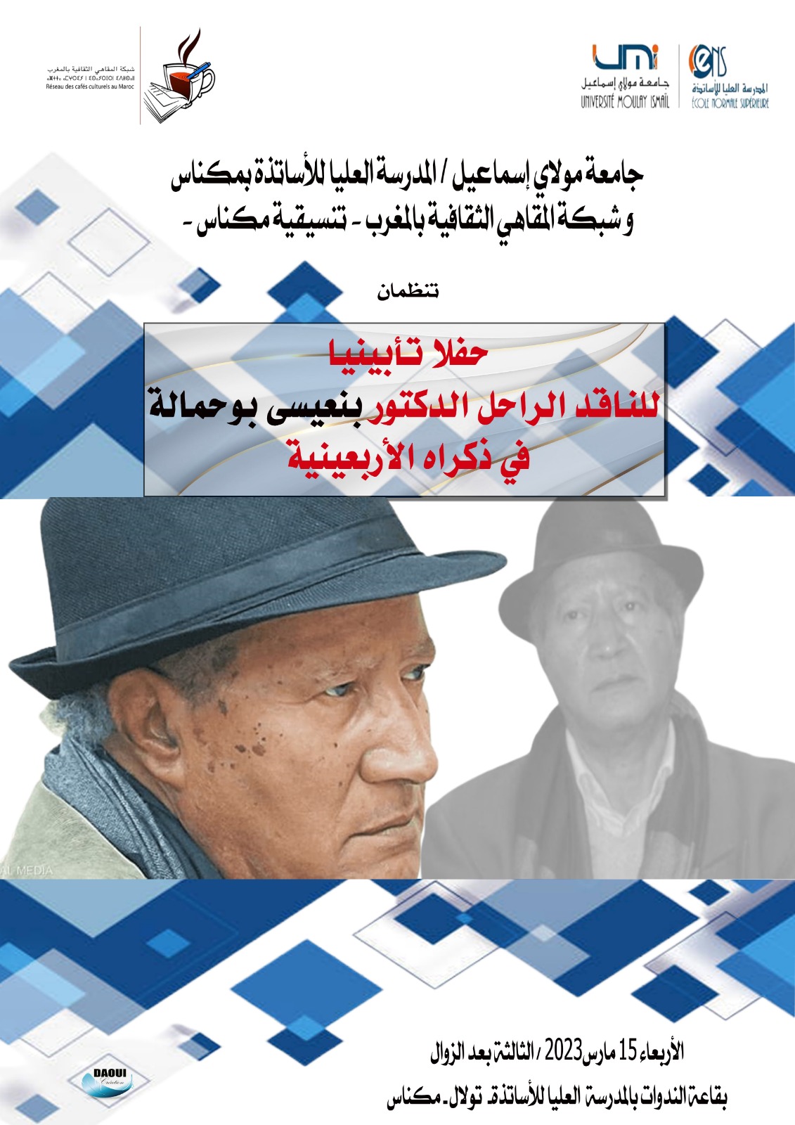 تستعد المدرسة العليا للأساتذة التابعة لجامعة مولاي إسماعيل بمكناس، وشبكة المقاهي الثقافية بالمغرب، لتنظيم حفل تأبيني للناقد الراحل الدكتور بنعيسى بوحمالة بمناسبة الذكرى الأربعينية لوفاته، وذلك يوم الأربعاء 15 مارس 2023، ابتداء من الساعة الثالثة زوالا بقاعة الندوات بالمدرسة العليا للاساتذة تولال بمدينة مكناس.