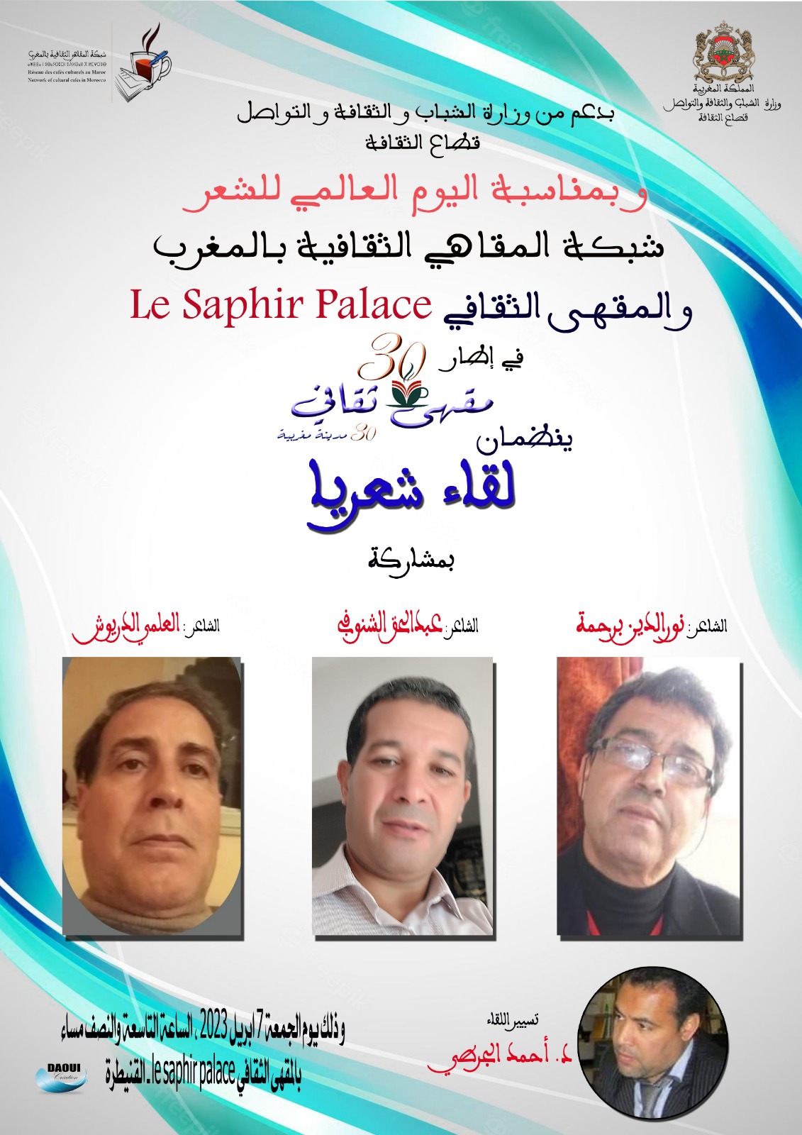 في إطار مشروع “30 مقهى ثقافي 30 مدينة مغربية”، أعلنت شبكة المقاهي الثقافية بالمغرب والمقهى الثقافي le saphir palace، عن تنظيم لقاء شعري، بدعم من وزارة الشباب والثقافة والتواصل قطاع الثقافة، وذلك بمشاركة الشعراء نورالدين برحمة، وعبدالحق الشنوفي والعلمي الديوش.