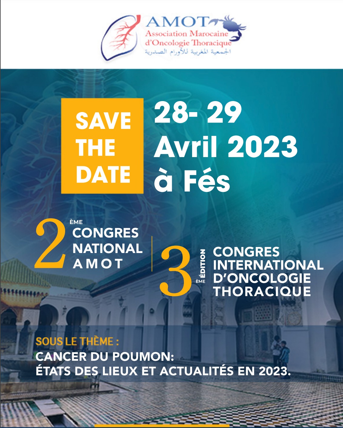 تستعد مدينة فاس لاحتضان فعاليات المؤتمر الوطني الثاني للأورام الصدرية والدورة الثالثة للمؤتمر الدولي للأورام الصدرية، الذي تنظمه الجمعية المغربية للأورام الصدرية AMOT، يومي 28 و 29 أبريل.