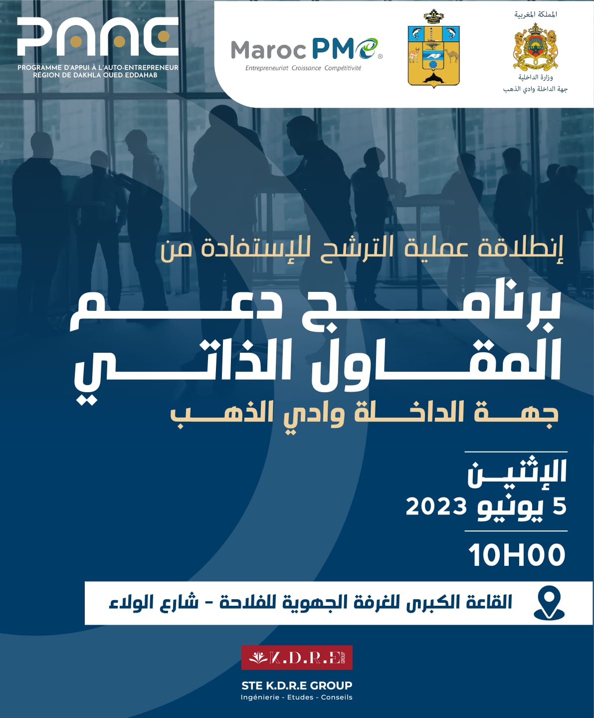 في إطار إتفاقية الشراكة الموقعة بين المجلس الجهوي للداخلة وادي الذهب والوكالة الوطنية للنهوض بالمقاولات الصغرى والمتوسطة (المسؤولة عن الكتابة العامة للجنة الوطنية للمقاولة الذاتية)، سيتم تنظيم يوم تحسيسي وتعبوي لدعم ريادة الأعمال الذاتية يوم الاثنين 5 يونيو 2023 الساعة العاشرة صباحًا بالقاعة الكبرى للغرفة الجهوية للفلاحة، بجهة الداخلة وادي الذهب.