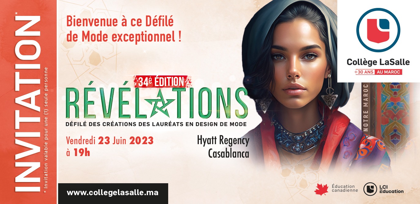 أعلنت «كوليــج لاســال المغــرب» Collège LaSalle Maroc، الرائدة في التعليم الكندي, والــتي تنتمي إلى الشــبكة الدوليــة الكنديــة LCI Éducation، عن تنظيم النسخة الـ34 من العرض الكبير للأزياء “Révélations”، وذلك يوم الجمعة 23 يونيو 2023.