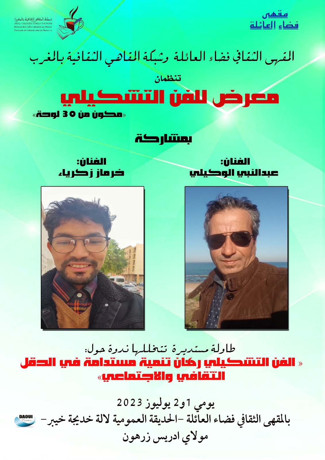 تنظم شبكة المقاهي الثقافية بالمغرب والمقهى الثقافي “فضاء العائلة” معرضا للفن التشكيلي للفنانين عبد النبي الوكيلي، وزكرياء خرماز موازاة مع مائدة مستديرة حول موضوع “الفن التشكيلي رهان تنمية مستدامة في الحقل الثقافي والإجتماعي”، وذلك يومي فاتح وثاني يوليوز 2023 بالمقهى الثقافي “فضاء العائلة” الكائن بمولاي ادريس زرهون.