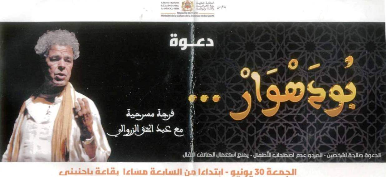 بعد عرضها بكل من تازة وفاس ومكناس، يقدم الفنان المسرحي عبد الحق الزروالي مسرحيته الجديدة “بودهوار…” يوم الجمعة 30 يونيو بقاعة أبا حنيني ابتداء من الساعة السابعة مساء.