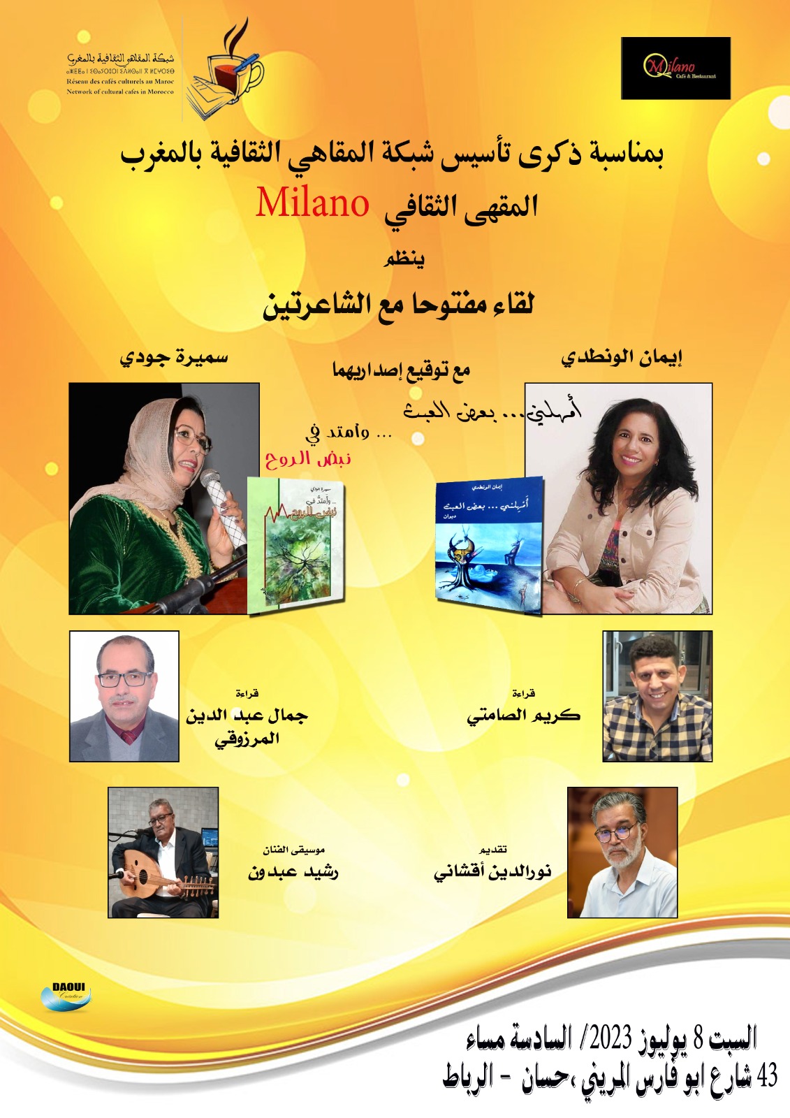 في إطار أنشطتها الثقافية والإشعاعية، وبمناسبة ذكرى تأسيسها، تنظم شبكة المقاهي الثقافية بالمغرب لقاء مفتوحا مع الشاعرتين إيمان الونطدي وسميرة جودي مع توقيع إصداريهما الشعري “أمهلني … بعض العبث”، و” …وأمتد في نبض الروح”، وذلك يوم السبت 8 يوليوز 2023 على الساعة السادسة مساء بمقهى milano الكائن بمدينة الرباط.