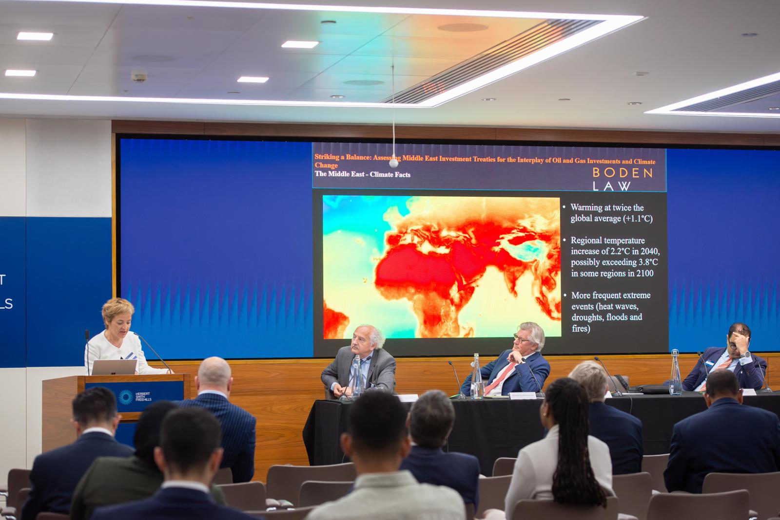 ركّزت الحلقة النهائية للنقاش في المؤتمر، والتي ساهم فيها كل من البروفيسور بيتر كاميرون Peter Cameron، ومحامي الملك مايكل باتشيت جويس Michael Patchett Joyce KC، وفيفيك كابور Vivek Kapoor، وديغر بودن Deger Boden، وناومي باريركليف Naomi Barriercliffe، على تقييم المعاهدات الخاصة بالاستثمار في الشرق الأوسط، وخاصة فيما يتصل بالاستثمار في قطاعيّ النفط والغاز، علاوة على التغيّر المناخي، وطرح المشاركون آراء قيّمة بخصوص العلاقات المتداخلة بين تلك العوامل فائقة الأهمية.