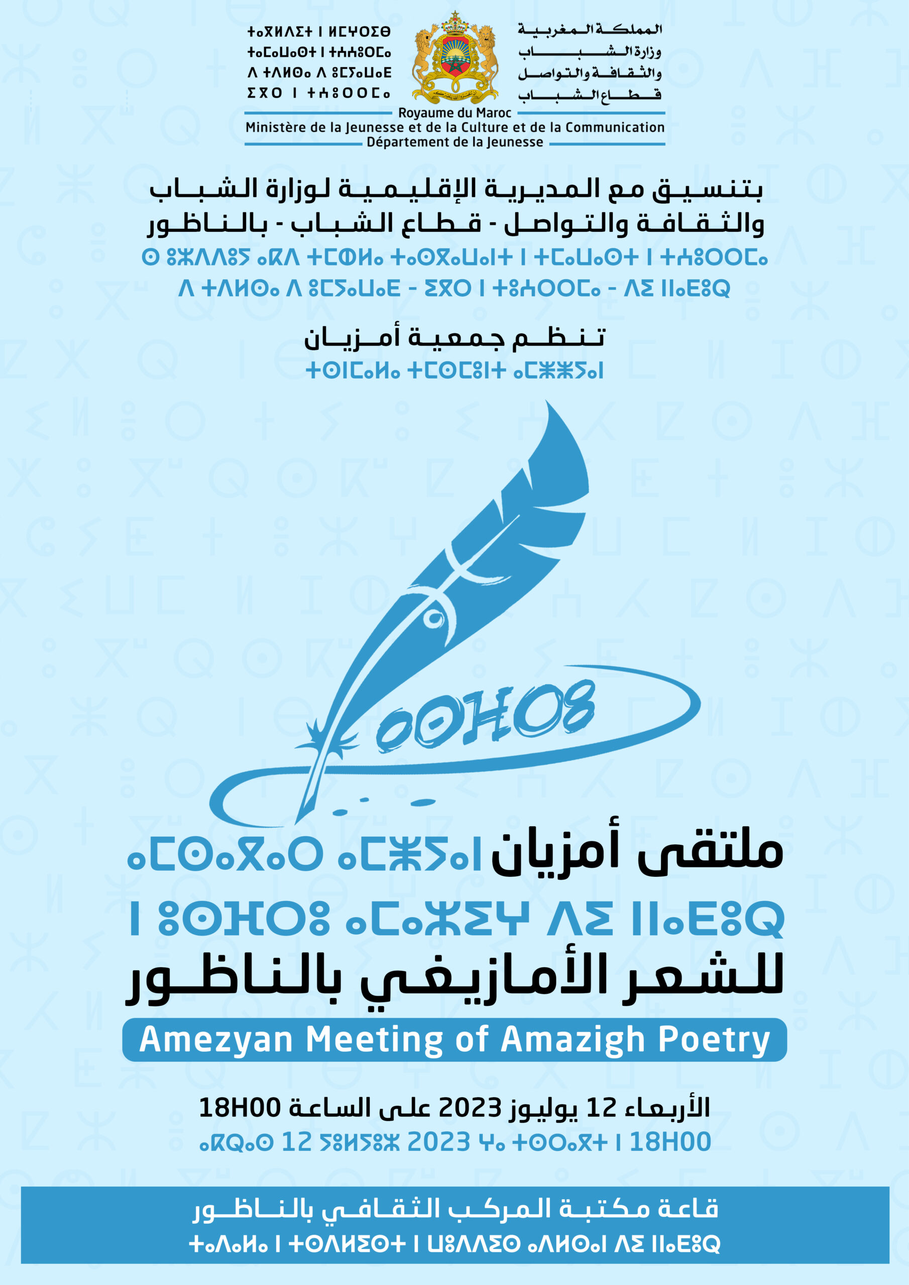 أعلنت جمعية أمزيان، بتنسيق مع المديرية الإقليمية لوزارة الشباب والثقافة والتواصل -قطاع الشباب- بالناظور، عن تنظيم “ملتقى أمزيان للشعر الأمازيغي” في دورته الأولى، وذلك يوم الأربعاء 12 يوليوز 2023 بقاعة مكتبة المركب الثقافي بالناظور على الساعة السادسة مساء.