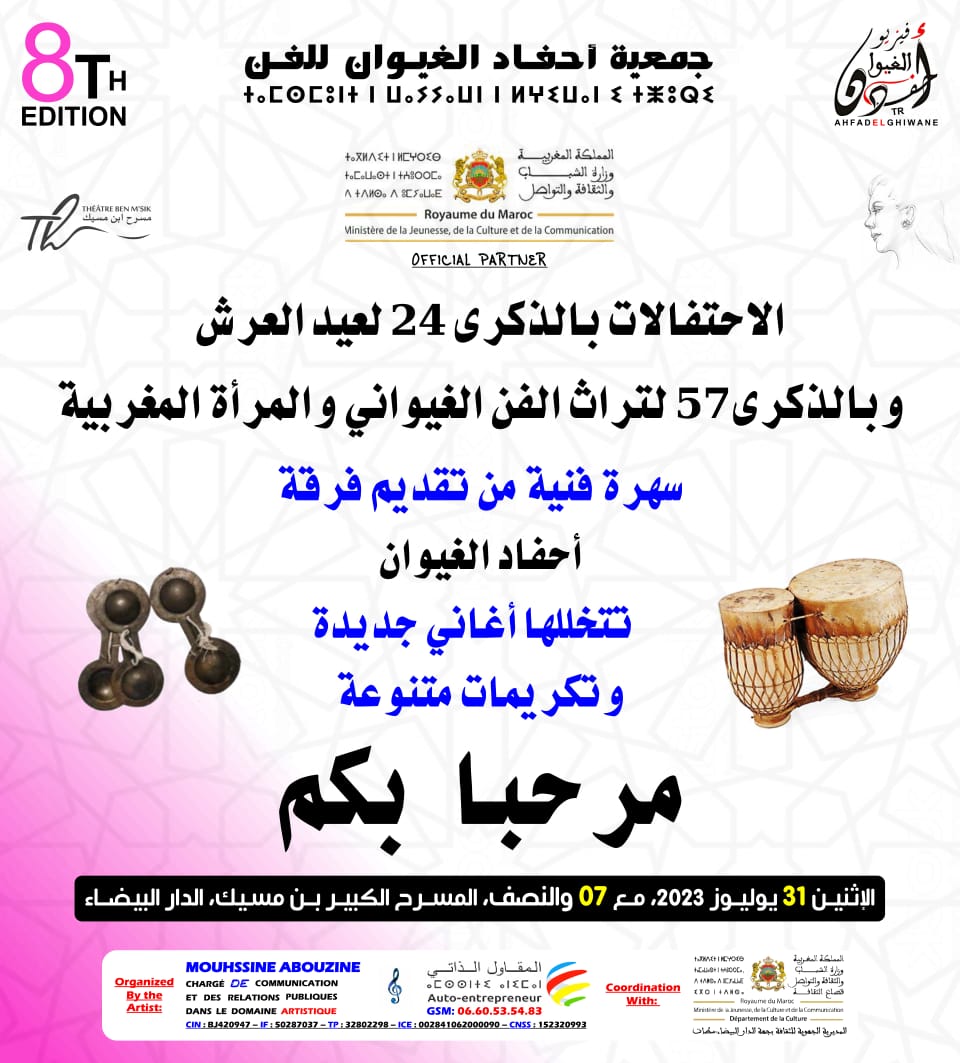 أعلنت مجموعة أحفاد الغيوان بقيادة رئيس المجموعة، الفنان محسن أبوزين، عن تنظيم الدورة الثامنة للتظاهرة الفنية والثقافية تحت شعار “المرأة والفن حياة”، يوم الإثنين 31 يوليوز ، وذلك في إطار الاحتفالات بالذكرى 24 لعيد العرش المجيد وبالذكرى 57 لتراث الفن الغيواني والمرأة المغربية.