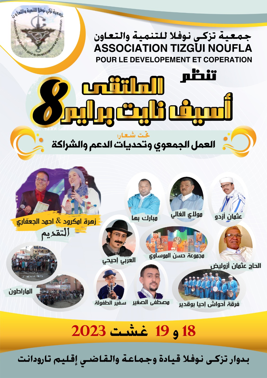 أعلنت جمعية تزكي نوفلا للتنمية والتعاون عن تنظيم النسخة الثامنة لملتقى أسيف نايت ابراهيم، بدوار تزكى نوفلا بتراب جماعة والقاضي بإقليم تارودانت، وذلك خلال يومي 18 و 19 غشت 2023.
