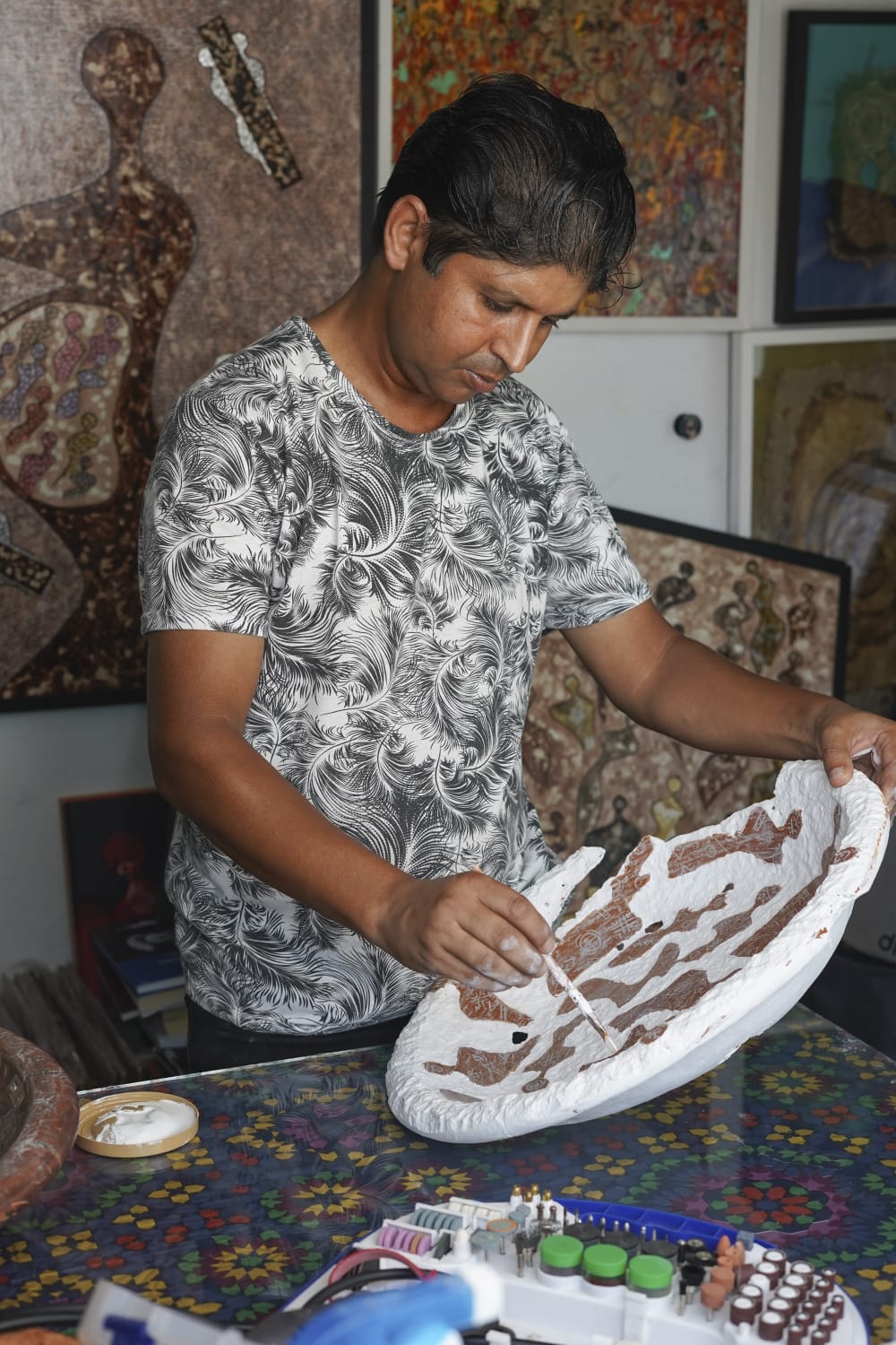 وحتى في الفترة التي كانت تقل فيها الامكانيات ومستلزمات الصباغة لم تكن متوفرة أو بالكاد منعدمة، لم تقف حاجزا أمام ممارستي لهوايتي؛ و جدت البديل وضالتي في بعض المواد الخام الموجودة بكثرة في الطبيعة والمحيط الذي ترعرعت فيه لعبت بها كنت اشكلها و اركبها بكل عفوية رغم انني لم اكن اعلم ابجدياتها ولا أفقه ما اقوم به في تلك المرحلة.