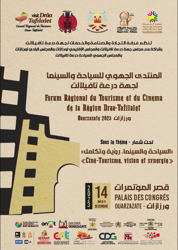 تستعد مدينة ورزازات لاحتضان فعاليات النسخة الأولى من المنتدى الجهوي حول السياحة والسينما، الذي تنظمه غرفة التجارة والصناعة والخدمات لجهة درعة تافيلالت، يوم الخميس 14 دجنبر 2023 بقصر المؤتمرات، بالتعاون مع مجموعة من الشركاء، وذلك تحت عنوان “القطاع السياحي والسينمائي، رؤية وتكامل”.