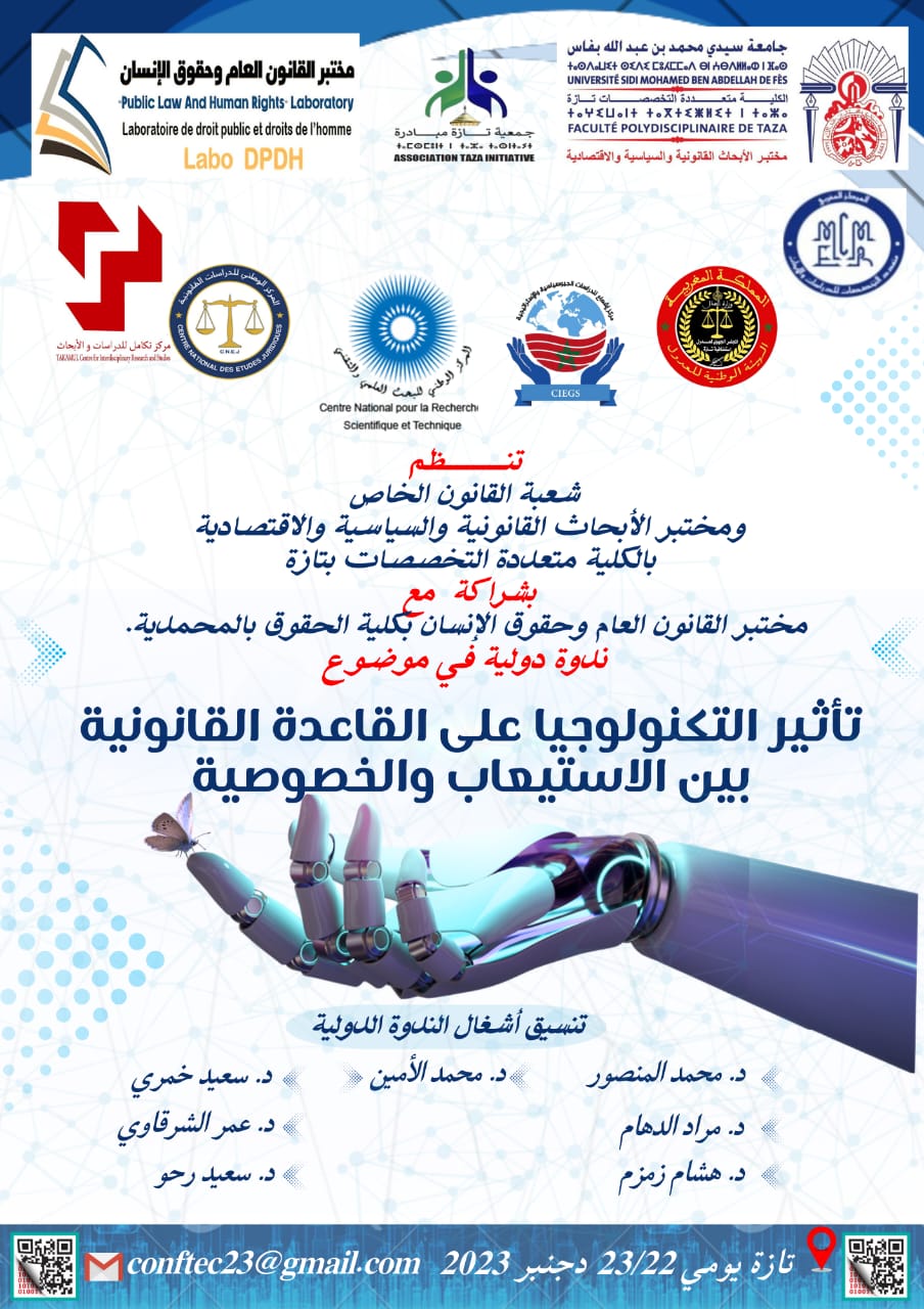 تجسيدا لمواكبة الجامعة للتطورات التكنولوجية، وباعتبارها منارة للبحث العلمي تستقبل الكلية متعددة التخصصات بتازة ندوة دولية من تنظيم مختبر الأبحاث القانونية والسياسية والاقتصادية المنتمي لذات الكلية، وبتنسيق مع مختبر القانون العام وحقوق الانسان التابع لكلية العلوم القانونية والاقتصادية والاجتماعية بالمحمدية، يومي 22 و23 دجنبر 2023. والموسومة ب «تأثير التكنولوجيا على القاعدة القانونية بين الاستيعاب والخصوصية”.
